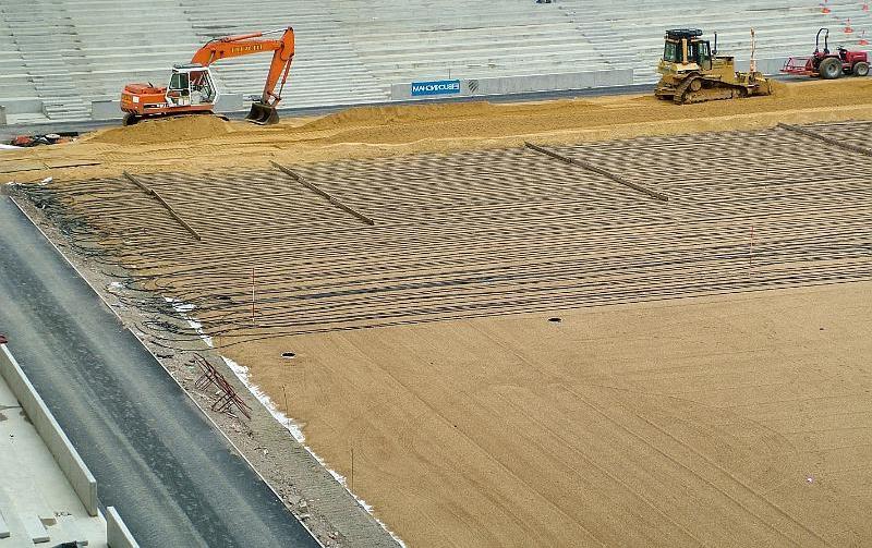 Основні роботи виконуються з використанням спеціалізованого обладнання – самохідного кабелеукладача або плуга, який здатний одночасно розмотувати до трьох котушок нагрівального кабелю. Машина акуратно прорізає ґрунт, укладає кабель на заданій глибині (як правило, близько 30 см), а потім закриває розріз, зводячи до мінімуму механічний вплив на поверхню газону. Такий спосіб укладання дає змогу не зупиняти роботу стадіону на тривалий термін і не пошкоджує структуру поля.